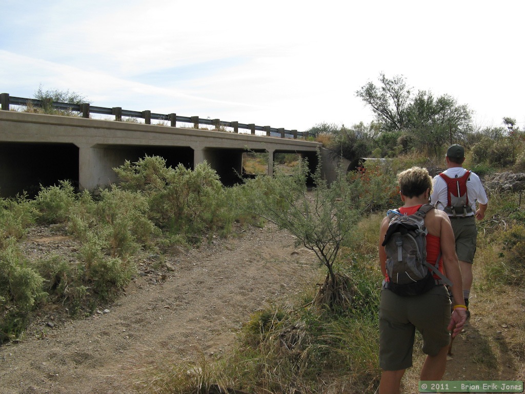 Passage 7 crosses several roads, Sahuarita Road, Highway 83, and Interstate 10. The trail goes over the first and under the later two. At Highway 83, the underpass is through a set of box culverts which Jerry had me photograph because he doesn't like the typical ADOT wing wall design and he wanted photos of an example of such so that he could come up with something better. (At this point I made fun of him for being a typical geeky engineer, and for always thinking of work.)