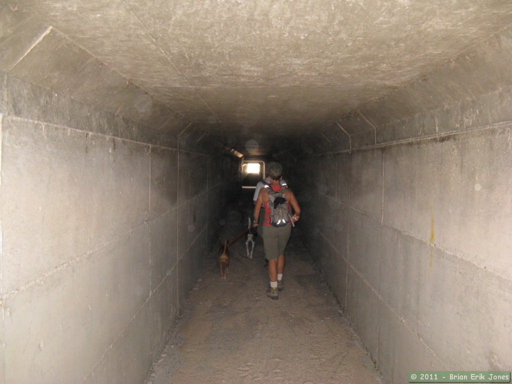 The route under I-10, however, is more like a long tunnel, with a skylight in the middle, and it actually gets pretty dark in the middle of the two sections. We couldn't see very well and would sometimes got surprised when we hit a patch of sand that had accumulated in the tunnel. It was interesting to walk through, and much safer (though I suppose less interesting) than trying to get across I-10 at road level. An old video game called Frogger comes to mind.
