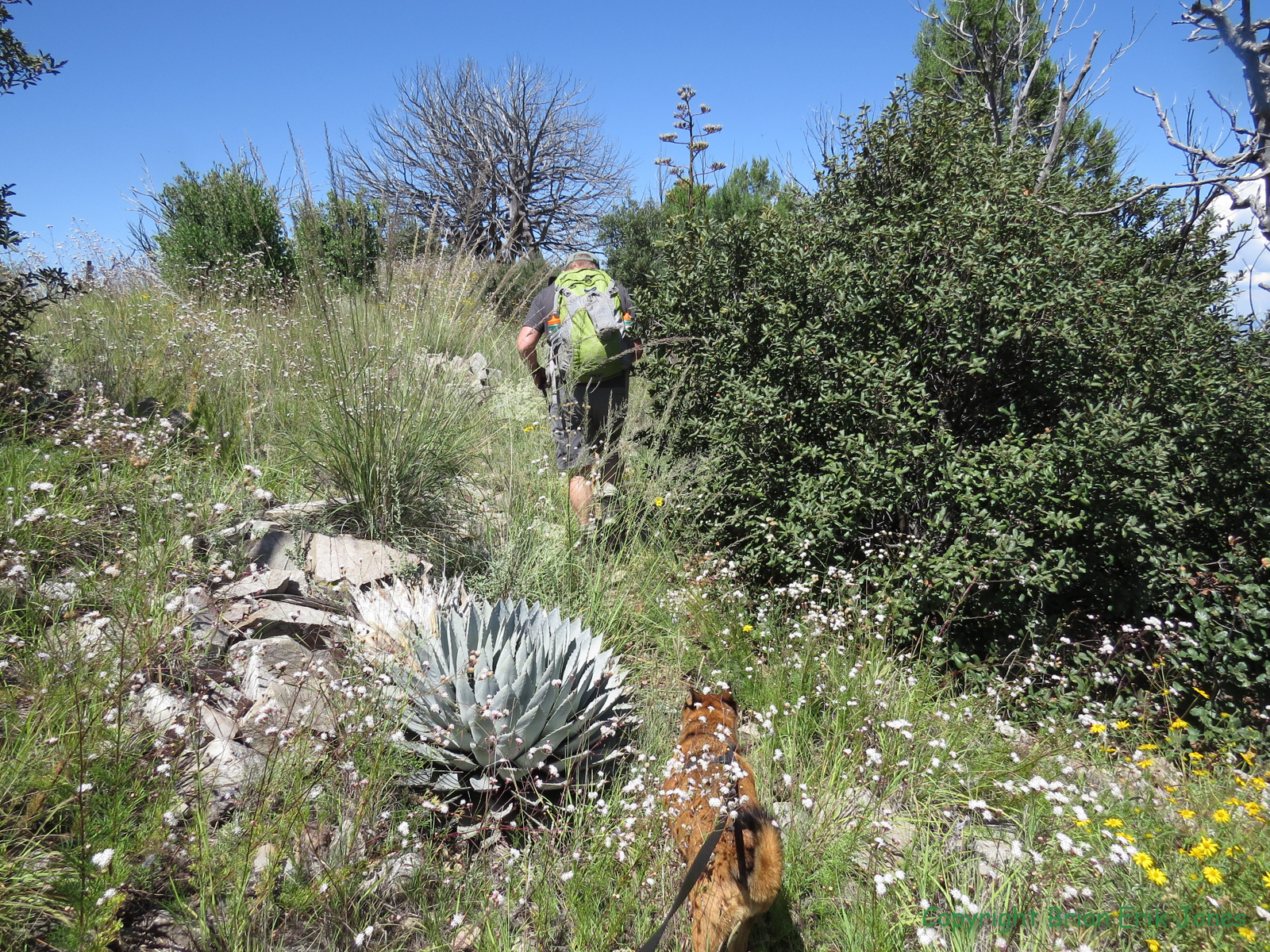 Jerry, Andrea (Cheetah), Shaun, the dogs and I got to the Marshall Gulch Trailhead a little after eight o'clock and were hiking before 9. The first part of this section goes up the paved road into Summerhaven, which was still waking up when we walked through. Just north of town the passage veers to the north and drops off the northern flank of the Santa Catalina Mountains. We were immediately immersed in a riot of wildflowers of all types. It was gorgeous, and I stopped frequently to take pictures of them.