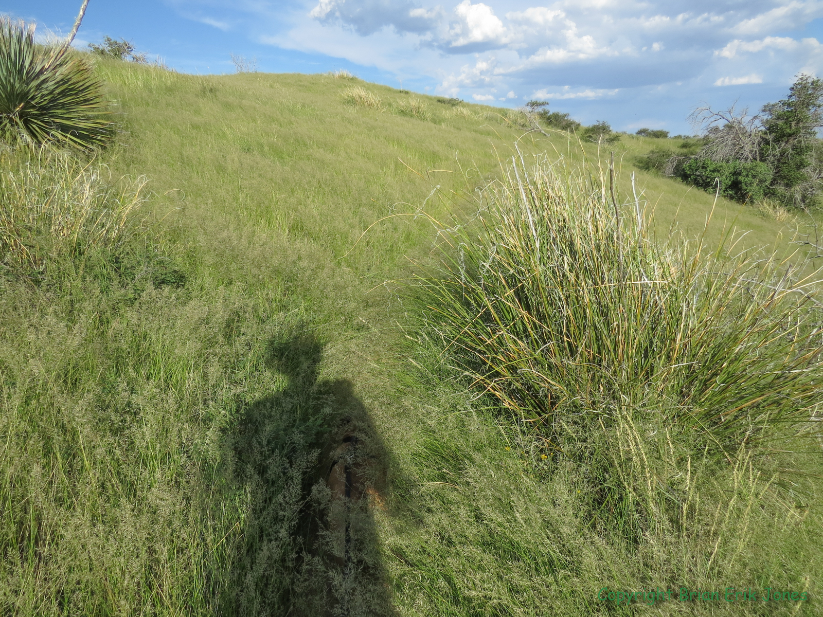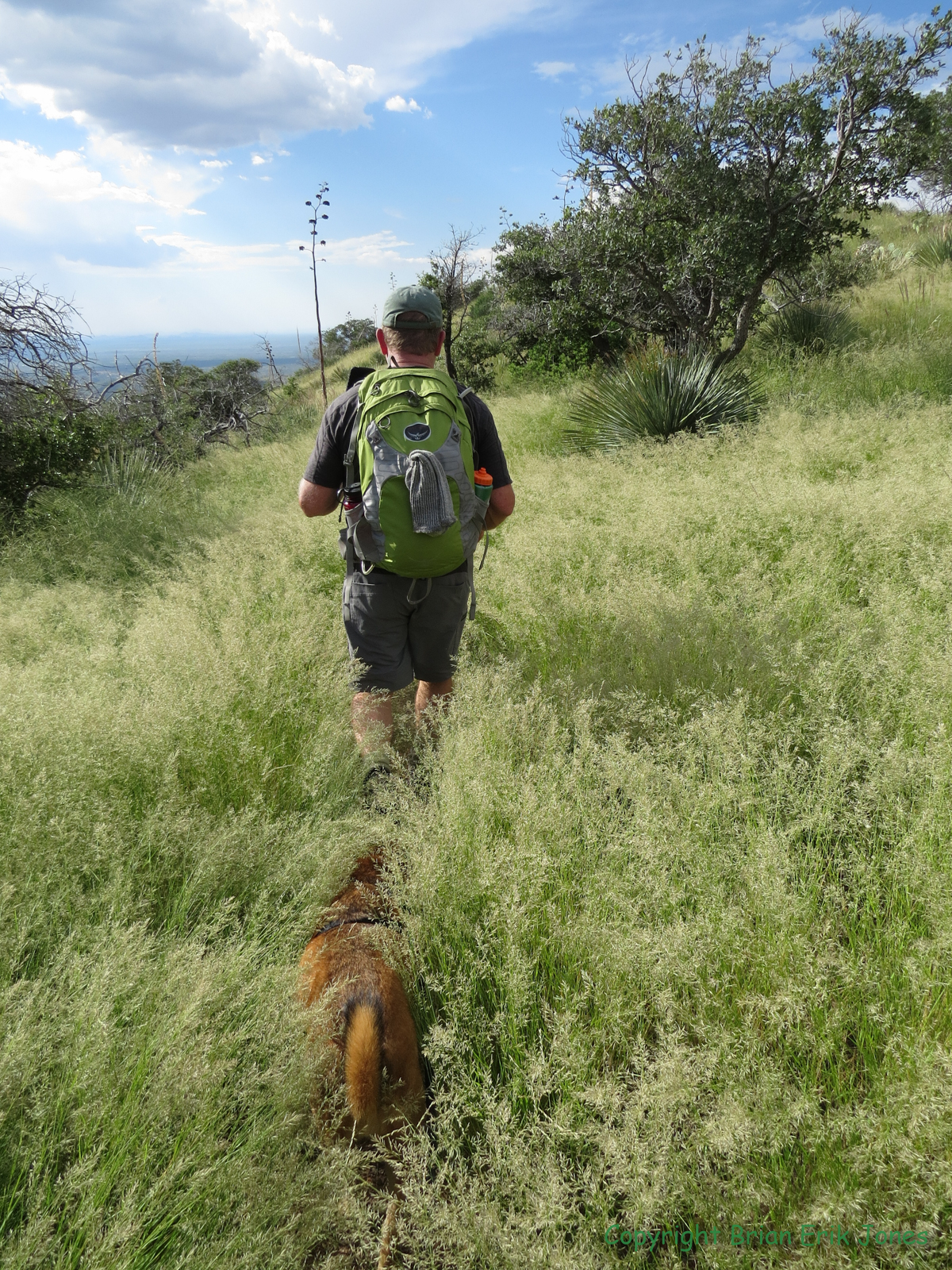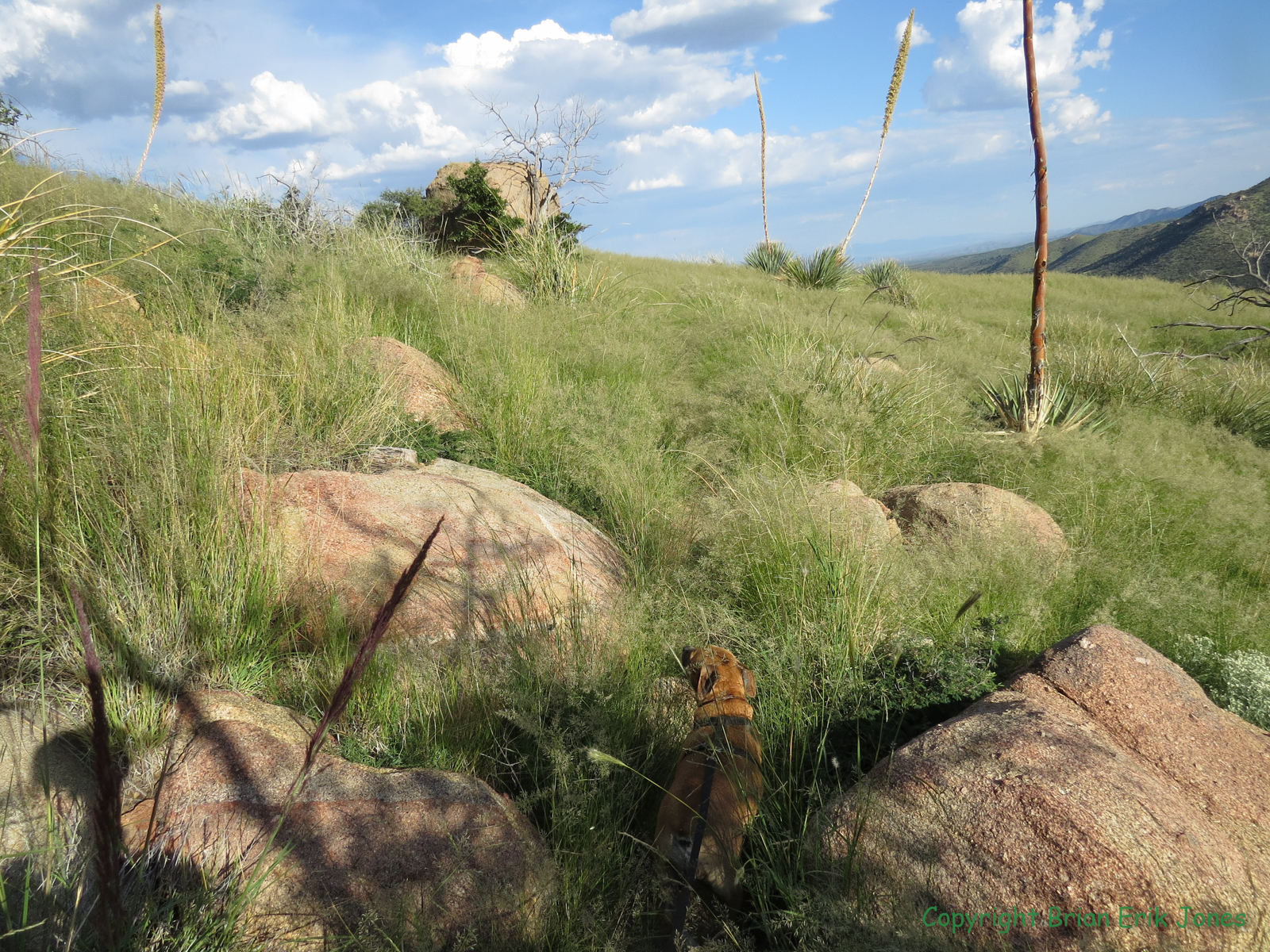 At this point Jerry and I swapped dogs, and I took the lead with Siyeh. The trail started moving through a lush grassland that was so thick that sometimes I could barely see her! (Of course, she's also a really short dog.) It was funny though, because she was hiking through what amounted to a tunnel of grass overhanging the trail. The grassland was also well populated with granite boulders and outcrops that was very picturesque. When the low evening sun broke through the clouds onto the landscape, it was pretty magical.