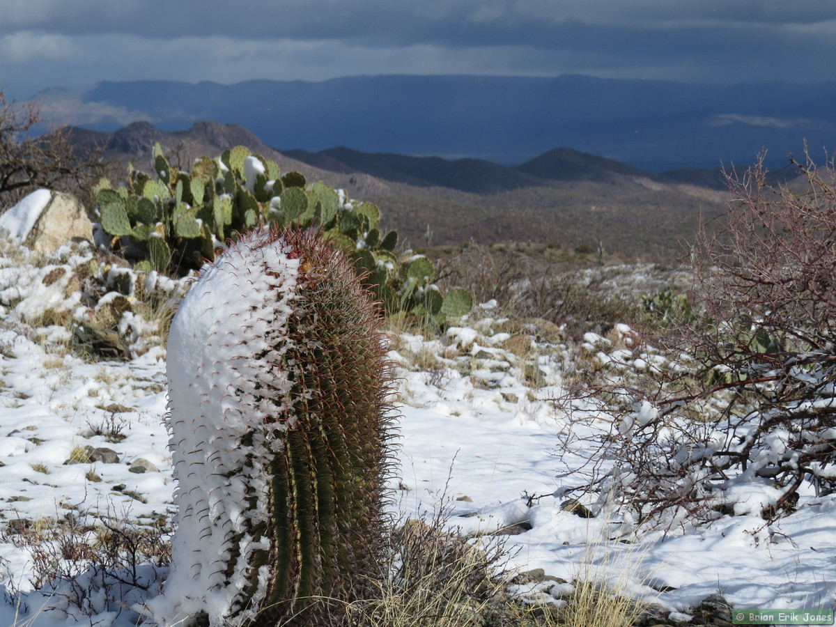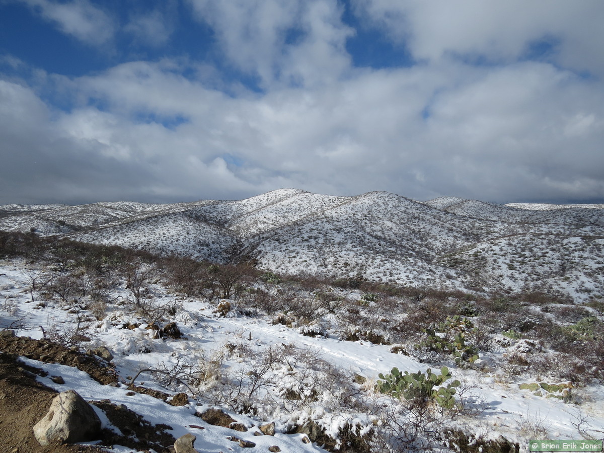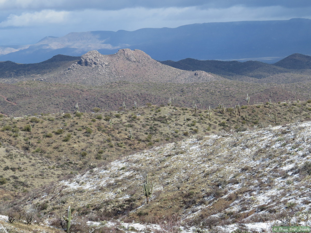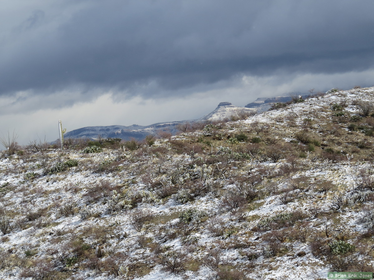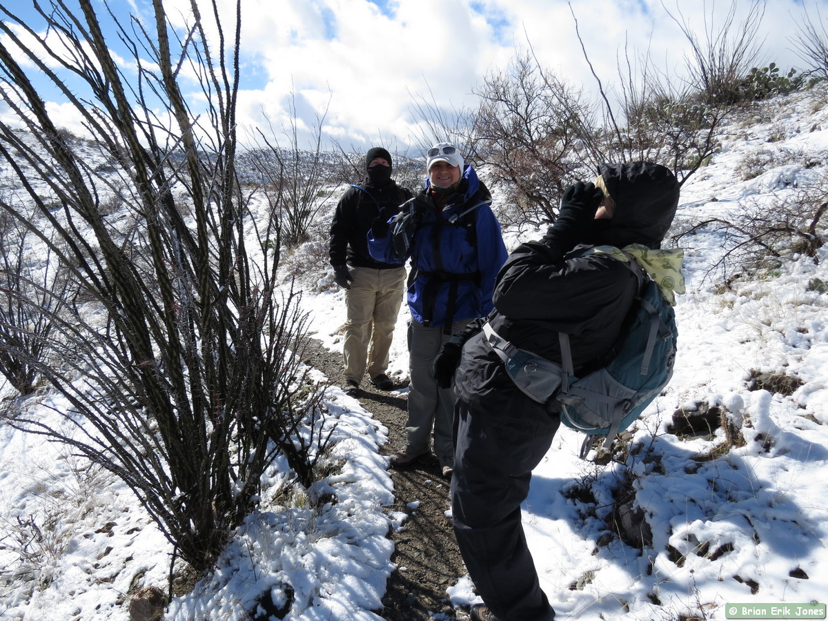 I woke to some fairly nasty weather (for southern Arizona), knowing that I would be out in it all day. I drove to Jerry and Andrea’s early this morning where we met Shaun and Raquel to hike the first half of AZT Passage 14. As we approached Oracle it started to snow, quite heavily at times.