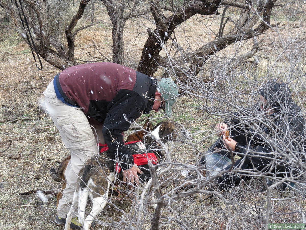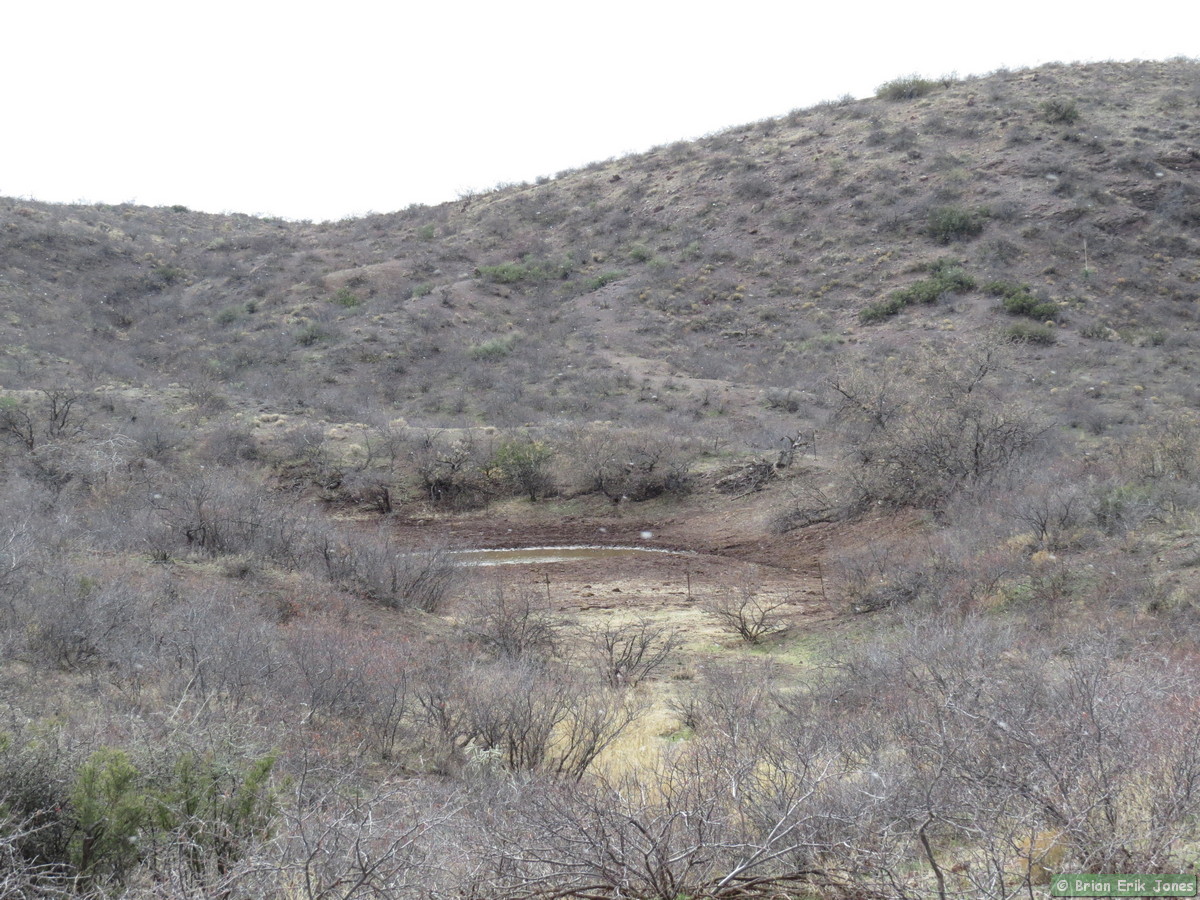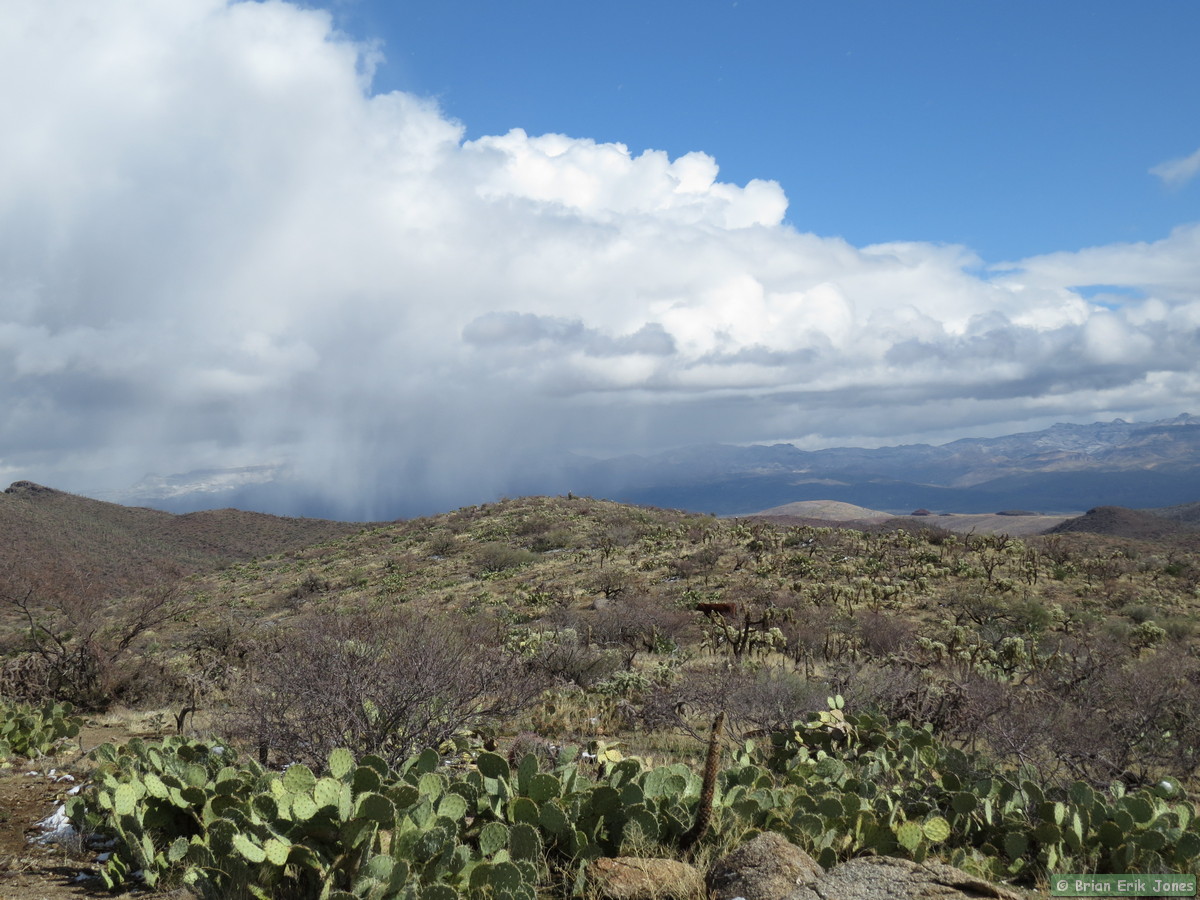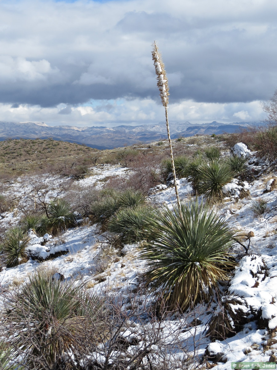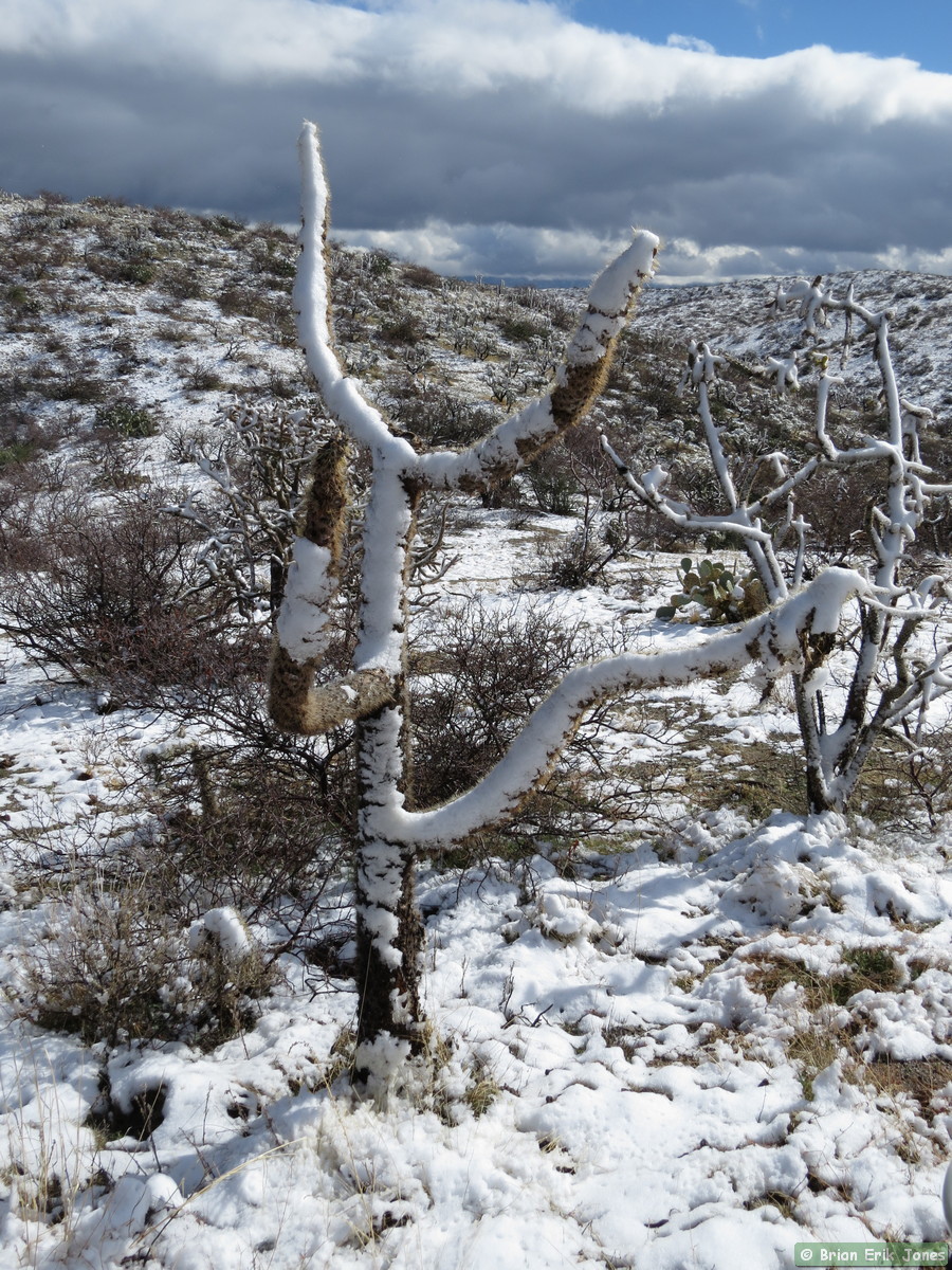 I woke to some fairly nasty weather (for southern Arizona), knowing that I would be out in it all day. I drove to Jerry and Andrea’s early this morning where we met Shaun and Raquel to hike the first half of AZT Passage 14. As we approached Oracle it started to snow, quite heavily at times.