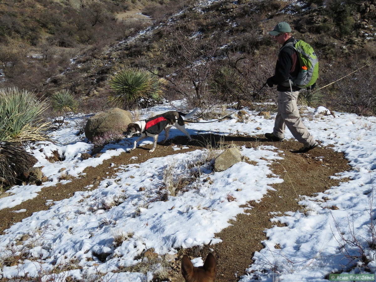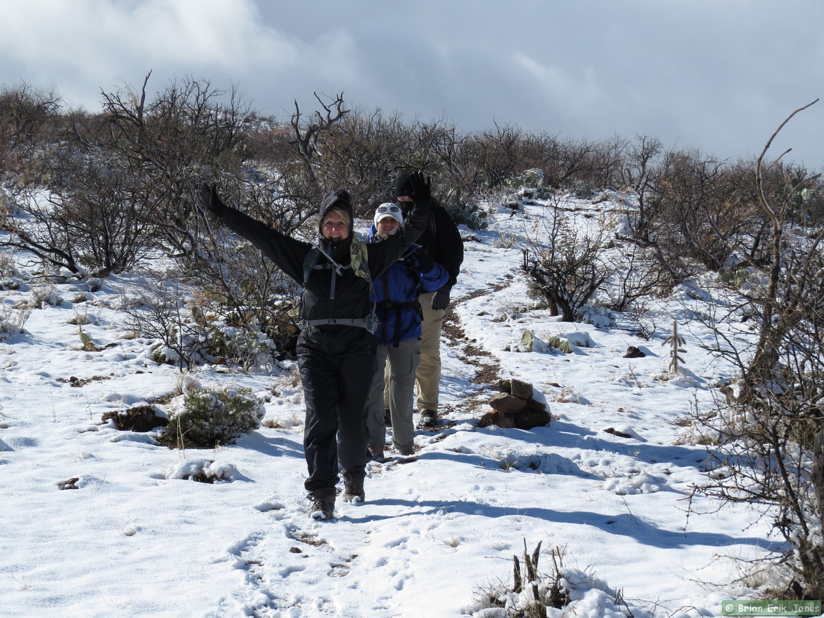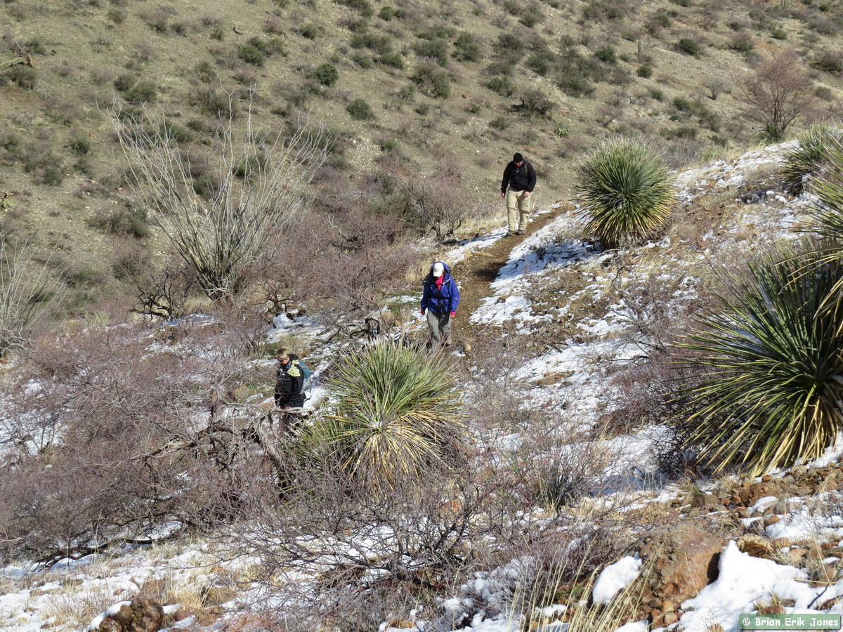 The snow slowed us down a little, as much because we were admiring it as because it made the trail a bit slippery. There’s something magical about a snow covered desert landscape. I would have liked to have stopped a lot more to take pictures and just enjoy the scenery, but we had to cover a lot of ground so I forced myself to keep moving most of the time.