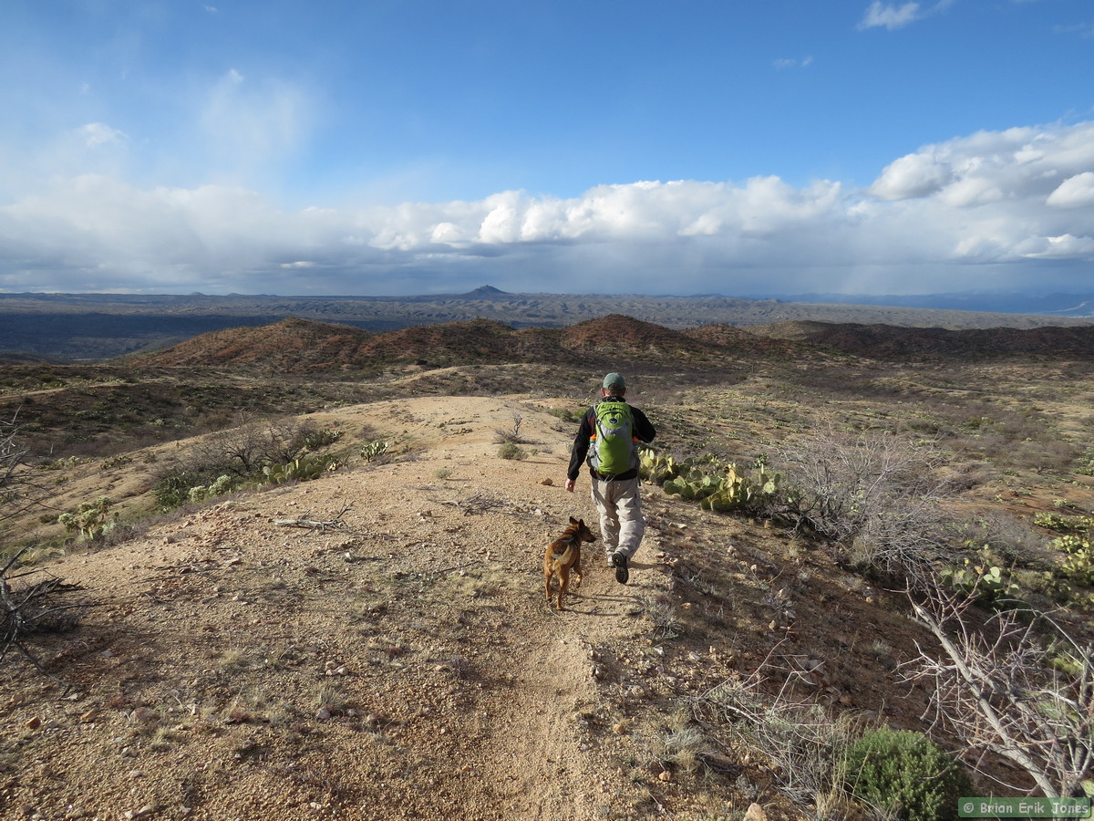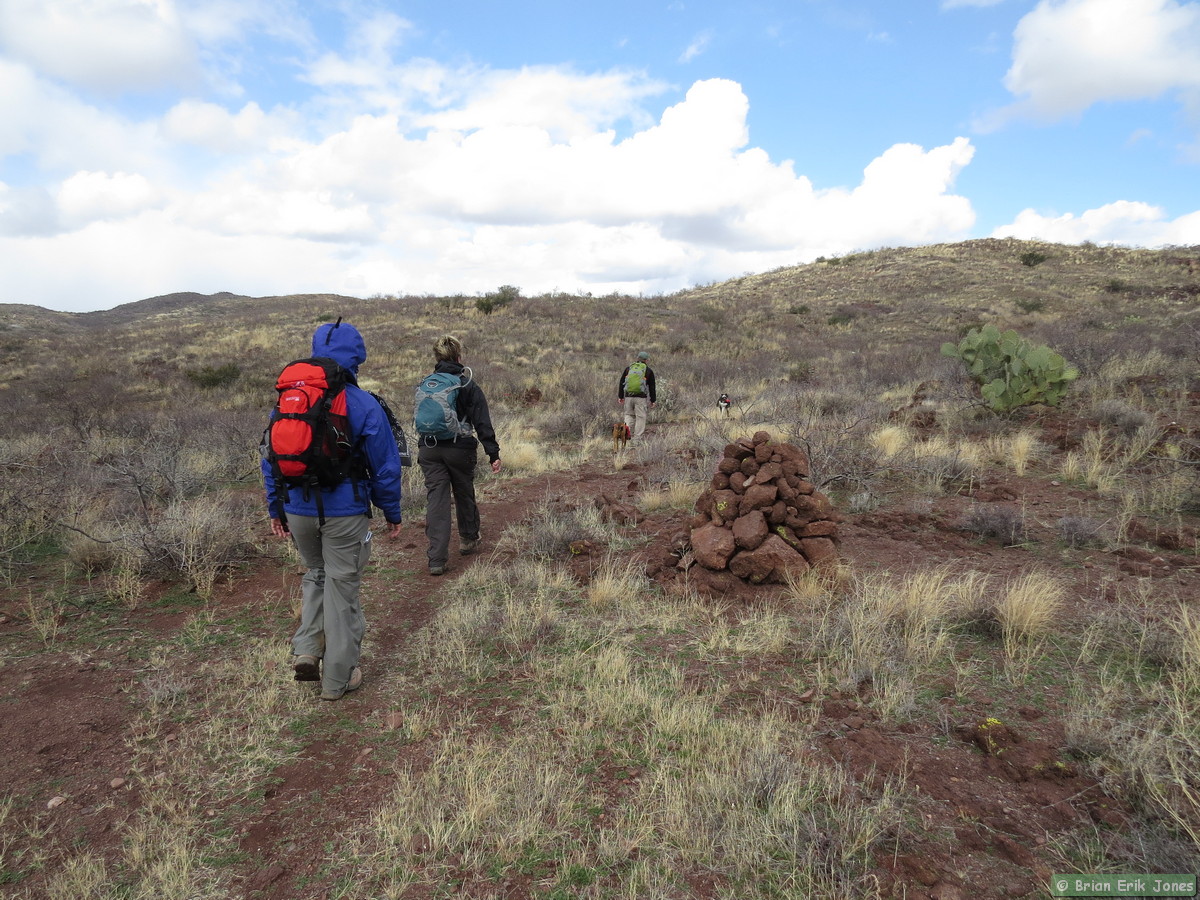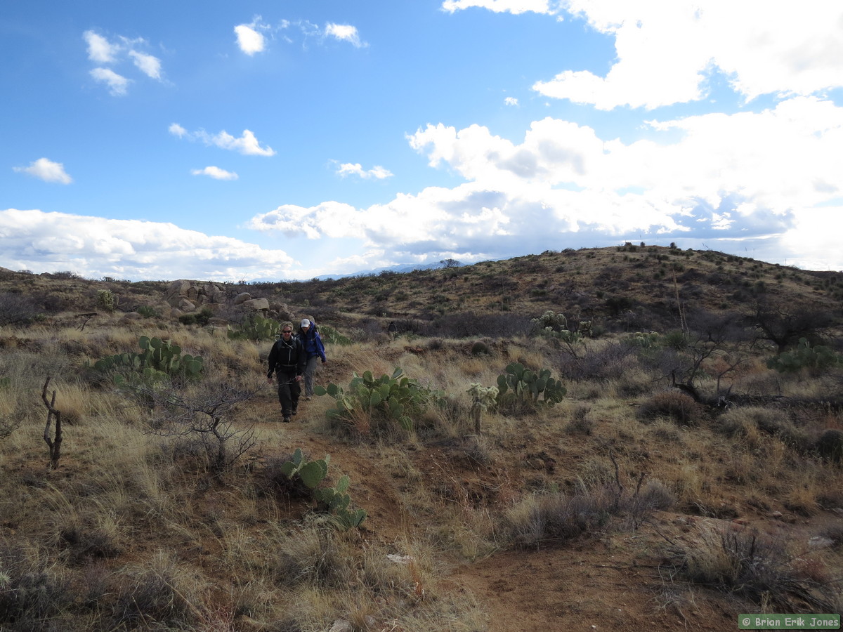 The first half of Passage 14 is rolling but generally descends over a dozen or so miles to Camp Grant Wash. The rolling nature made staying comfortable a bit of a challenge. It was easy to get hot and sweaty on the climbs, but we shed layers at our own peril, because as soon as the trail leveled out the biting wind quickly made us want to put back on whatever we took off.