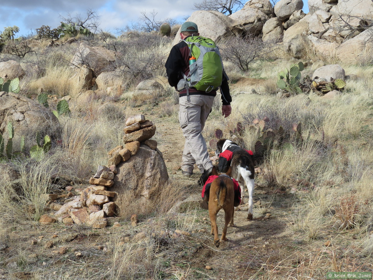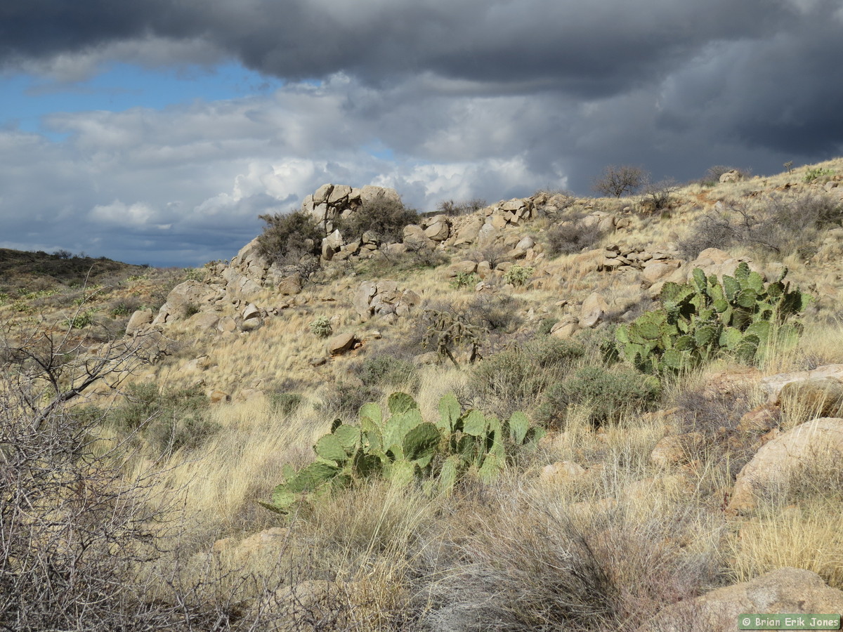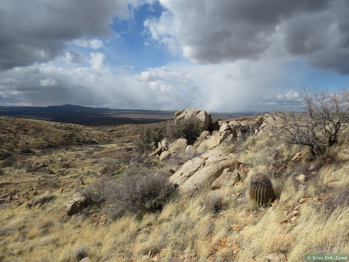 The first half of Passage 14 is rolling but generally descends over a dozen or so miles to Camp Grant Wash. The rolling nature made staying comfortable a bit of a challenge. It was easy to get hot and sweaty on the climbs, but we shed layers at our own peril, because as soon as the trail leveled out the biting wind quickly made us want to put back on whatever we took off.