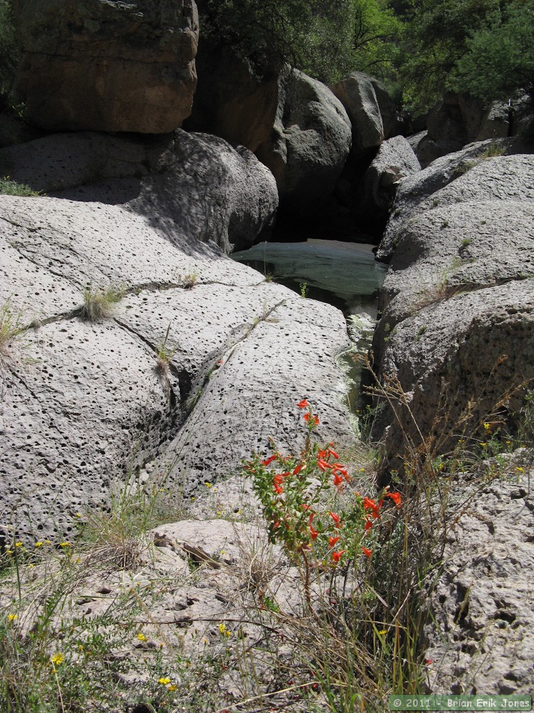 Mindy, Brad and I persevered for a while longer before finally reaching a spot that none of us were particularly keen on trying to get through or around. I probably would have gone on had someone wanted to, but I was certainly somewhat less than enthusiastic about continuing solo, so all three of us headed back to Aravaipa Creek. The decision turned out to be fortuitous.
