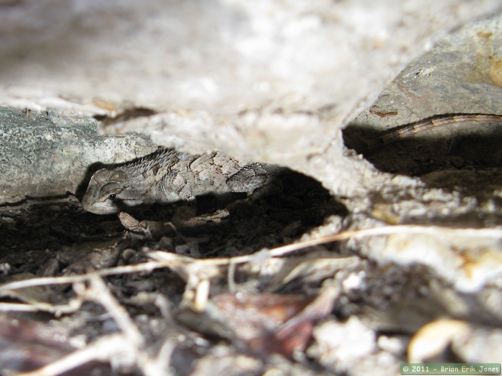 At a narrow pool of water formed in a scoured out crevice I hunted for frogs to take photographs of. It took more than 10 minutes before I found a frog before it found me and leapt into the depths of the pool. He was confident enough in his disguise that he let me approach closely. Not wanting to disavow him of his notion of being invisible, I backed away from him as carefully as I had approached. He never moved.