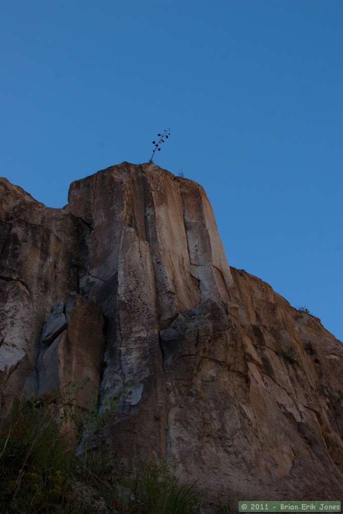 He made his way to a large boulder directly opposite though slightly higher than my location. As he stared at me from atop that boulder, I stared back at him from a ledge not much bigger than my two feet, about 20 feet up a nearly vertical cliff. It was a Mexican stand-off to see who would move first. Fifteen minutes later, he won the stand-off by laying down on top of the boulder. He was obviously prepared to wait a while, and I didn't have the luxury of a place to sit down.