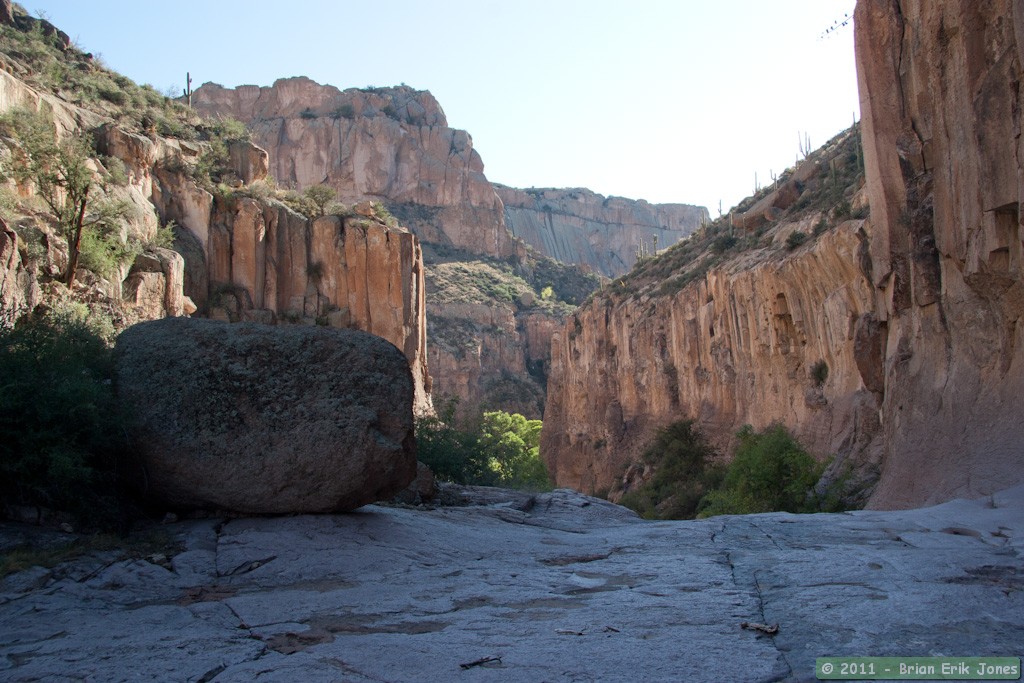 I found another, quite easy way up on the right side of the canyon and discovered yet another amazing pool, this one at the base of a vertical dryfall with a slick, sloping approach. Getting up this canyon wasn't getting any easier. As I contemplating finding a way around the dryfall I noticed that my established turn-around time was only five minutes away. Surmounting the obstacle would take time, and I suspected that I was already likely to run out of daylight before getting back to camp. I had my headlamp with me so darkness wasn't a huge problem, but I also didn't want anyone to worry about me, so I reluctantly turned and made my way back down to Aravaipa Canyon and back to camp.