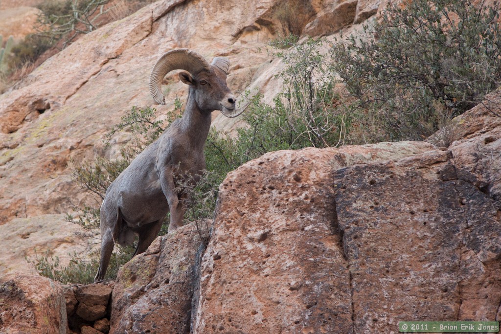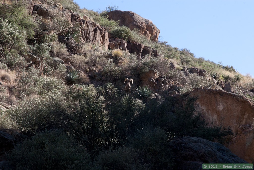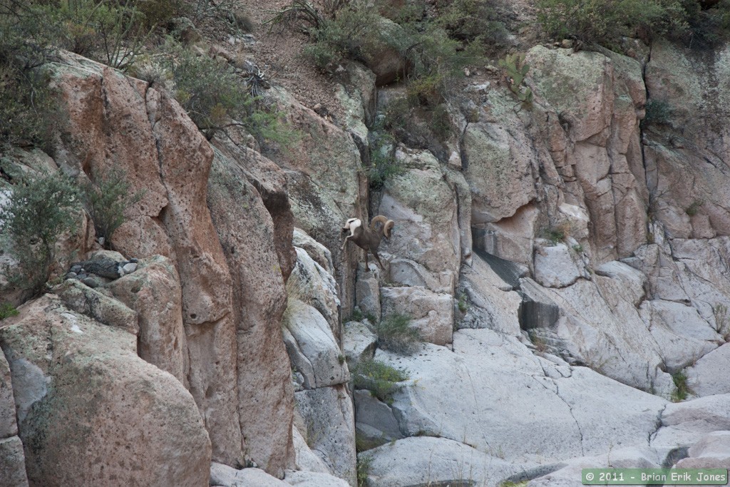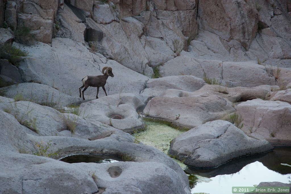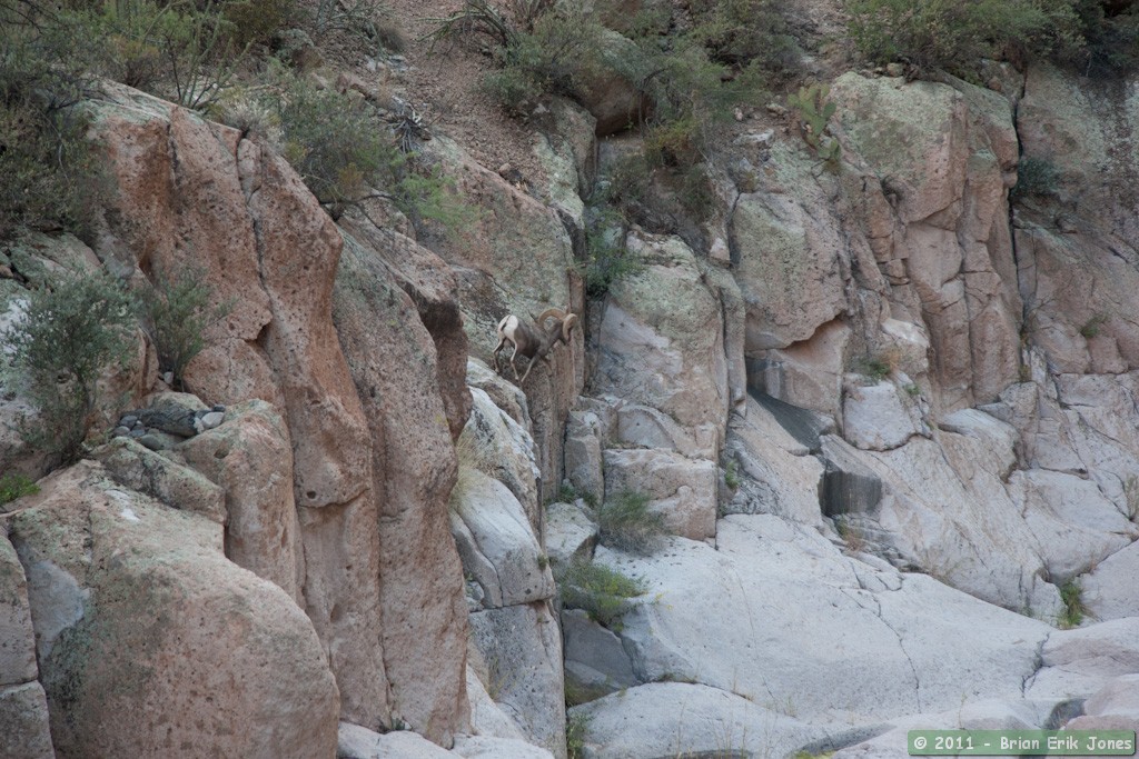 After I had gone a couple hundred feet or so, he went on the move again himself. Despite all the water in Aravaipa Creek being, for him, just a hop, a skip and a jump away, he seemed intent on drinking from the pools of water I had just passed. I moved behind a large boulder and climbed atop it to capture his approach to the water. Sure enough, he soon appeared in the canyon bottom. Watching bighorn move in steep terrain is a thing of wonder.