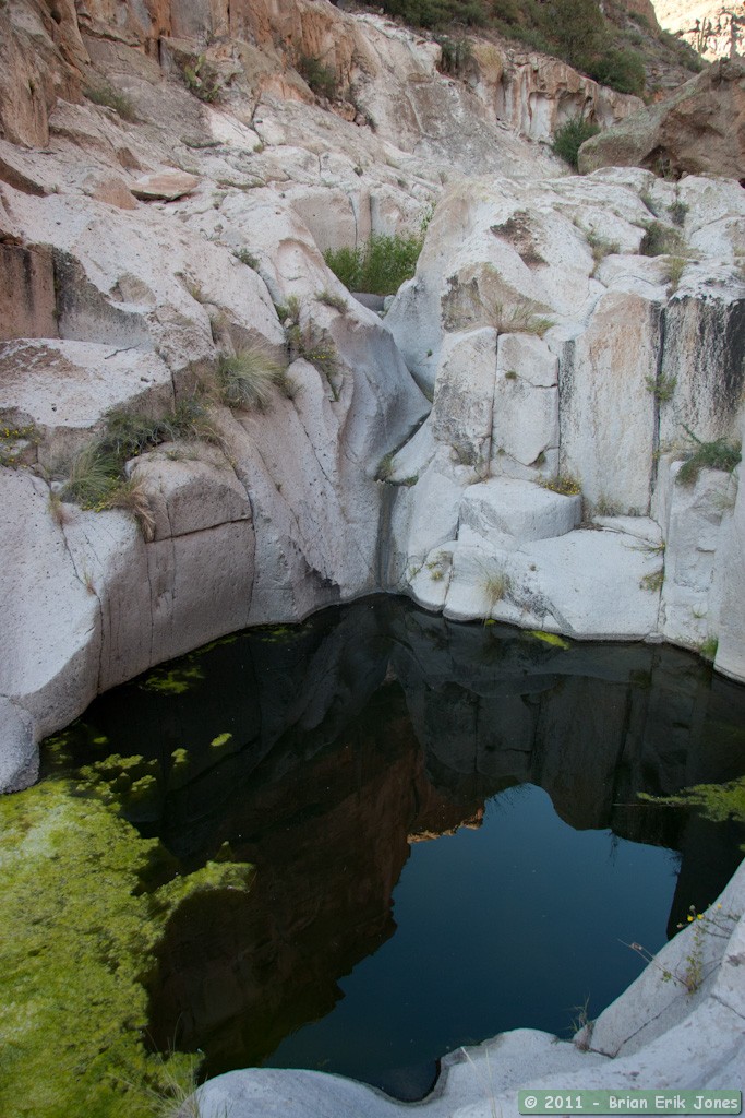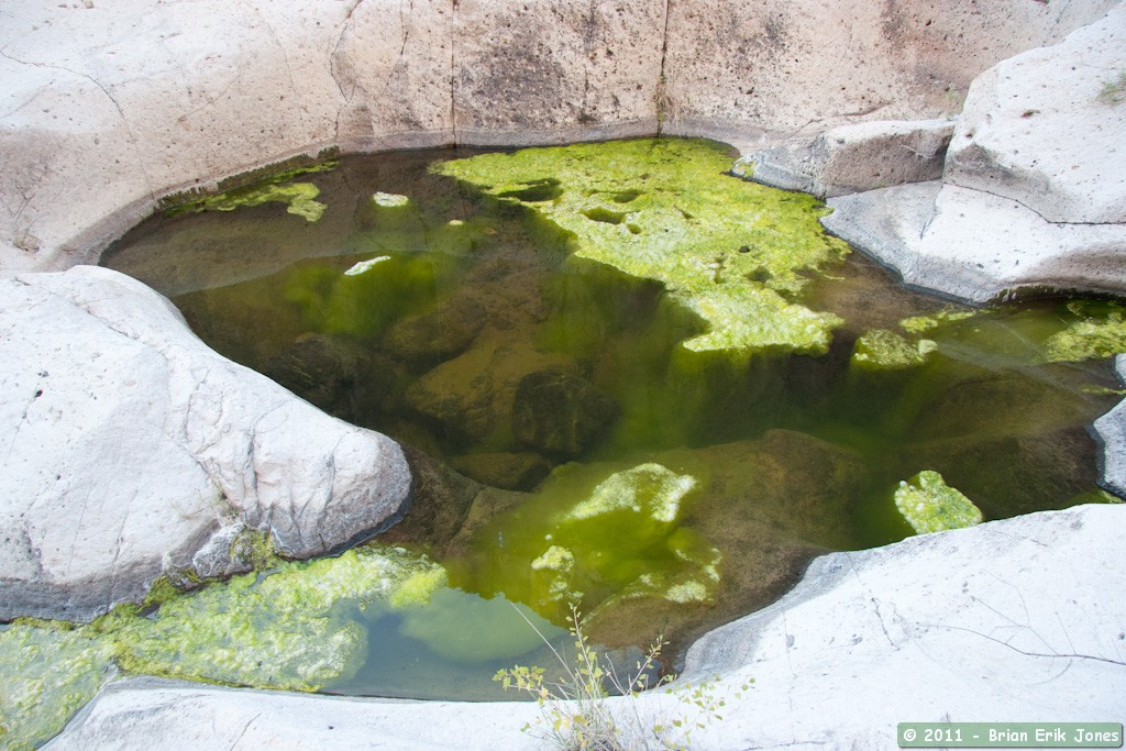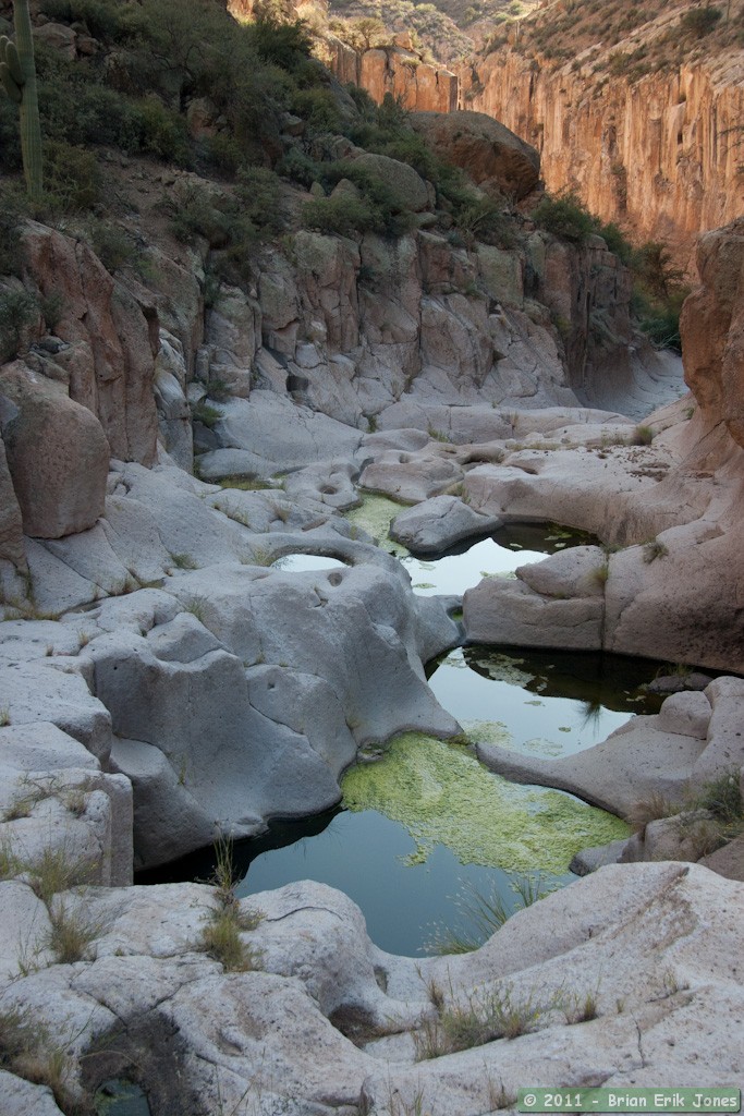 Once rejoined, we all hiked up the canyon and continually encountered dark pools of water, often algae covered.