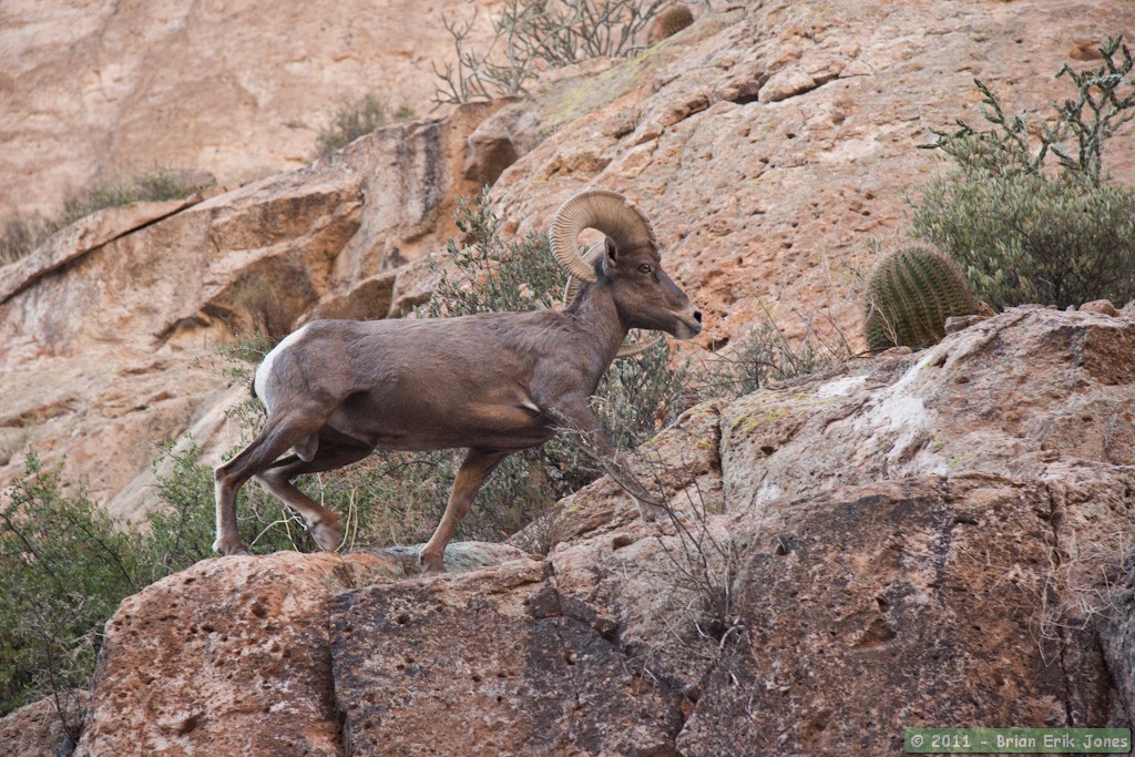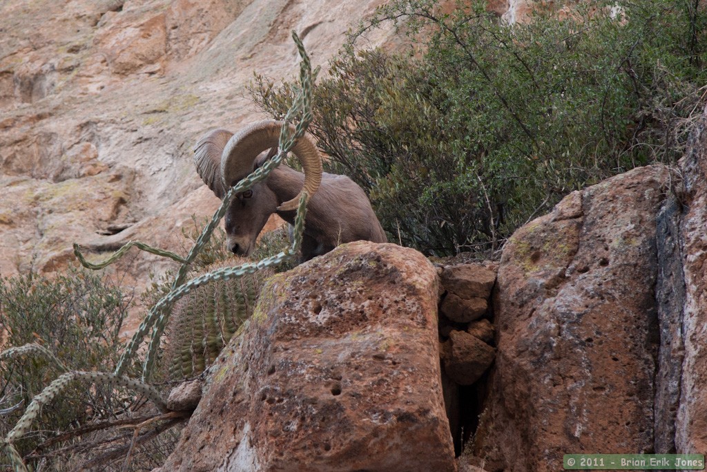 He munched lazily at the fruit of a barrel cactus clinging to the edge of the cliff, then started to make his way up canyon and up slope. While he didn't seem particularly concerned about me, I didn't want to wear out my welcome so I thanked him and bid him farewell. And thus we parted ways, though I often looked for and sometimes found him grazing up on the canyon slope.