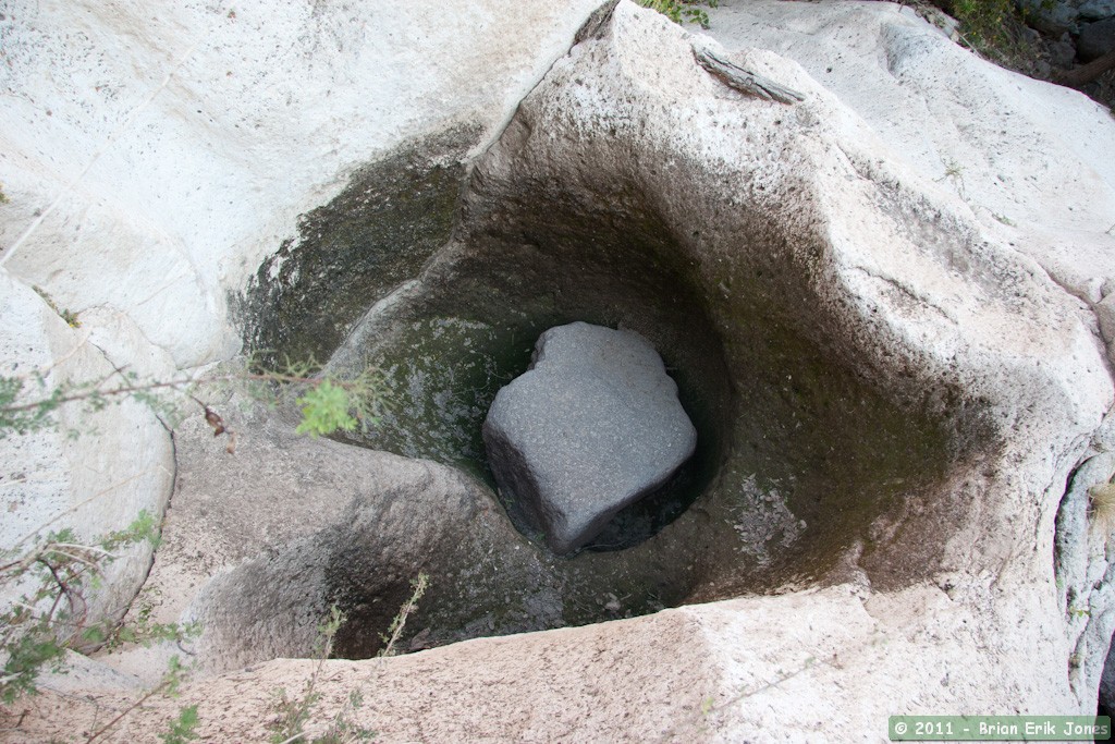 All this cloaked the apparent alter ego of the canyon though. Clearly there have been times when these pools were far from quiet. I found huge boulders trapped in even larger scour holes cut right into the bedrock. They were a testament to the massive force of flood waters raging down the canyon. One pair of holes were 4-6 feet in diameter, deeper than they were round, and perched more than 6 feet above the canyon bottom. Truly impressive.